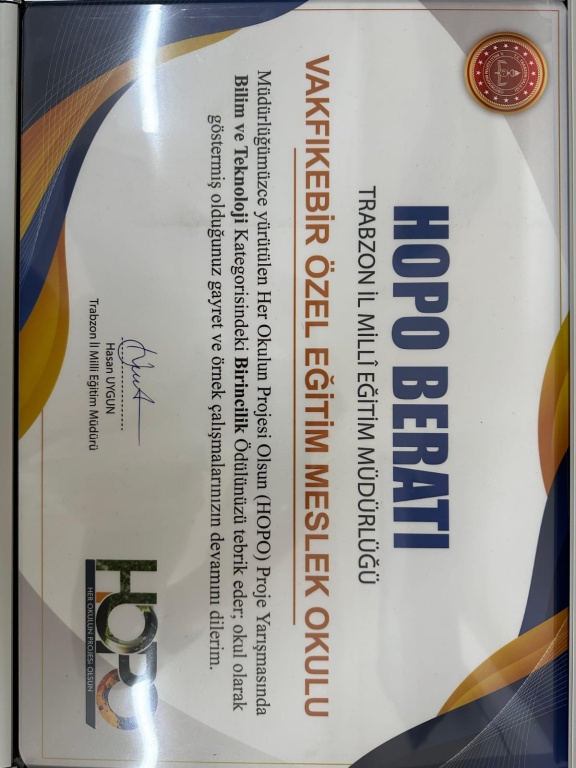 Trabzon İl Milli Eğitim Müdürlüğünün Koordinatörlüğünde yürütülen “HER OKULUN PROJESİ OLSUN (HOPO)” yarışması kapsamında, projenin ana kategorilerden biri olan “Bilim ve Teknoloji Kategorisi” alanında “Bilginin Peşinde Eğlenceli Bir Yolculuk” sloganıyla okulumuz öğretmenleri Kezban YETER ve Mustafa BAYRAKTAR öncülüğünde yürüttüğümüz “Bilgi Maratonu” adlı projemiz İL BİRİNCİLİĞİ kazanmıştır.