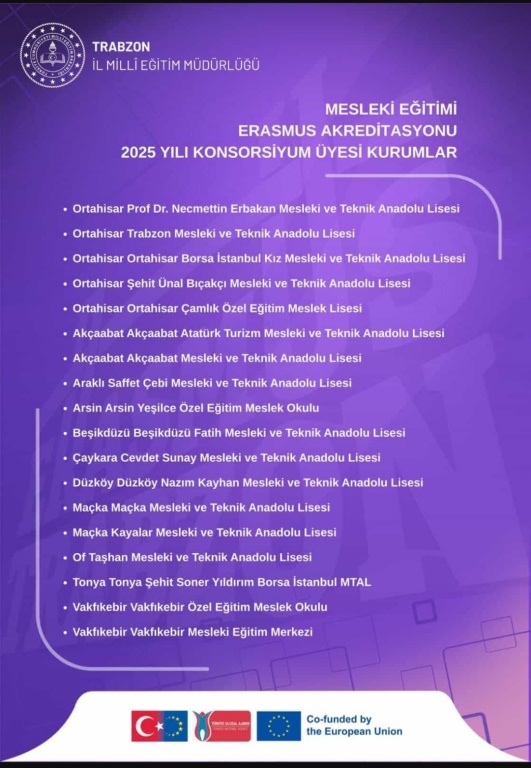 Okulumuz 2025 Erasmus Akreditasyonu kapsamında Trabzon İl Milli Eğitim Müdürlüğü Konsorsiyumuna Okul Eğitimi ve Mesleki Eğitim alanlarında katılmaya hak kazanmıştır.